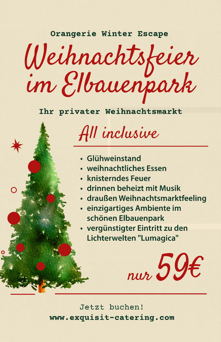 Die köstlichen Weihnachtsgerichte werden mit viel Liebe zubereitet, teilweise sogar direkt vor Ort beim Live Cooking. Sie können diese zusammen mit den Getränken an unseren festlichen Weihnachtsmarkt-Ständen genießen – alles inklusive. Möchten auch Sie Ihre Weihnachtsfeier mit Ihren Kollegen mal „anders“ verbringen? Dann freuen wir uns über eine Reservierung ab 35 Personen bis max. 80 Personen (im Indoor Bereich) und bis zu 120 Personen in Kombination mit dem Outdoorbereich. Buchbar vom 01.11.2025 bis 17.12.2025. (80€ p.P. netto)